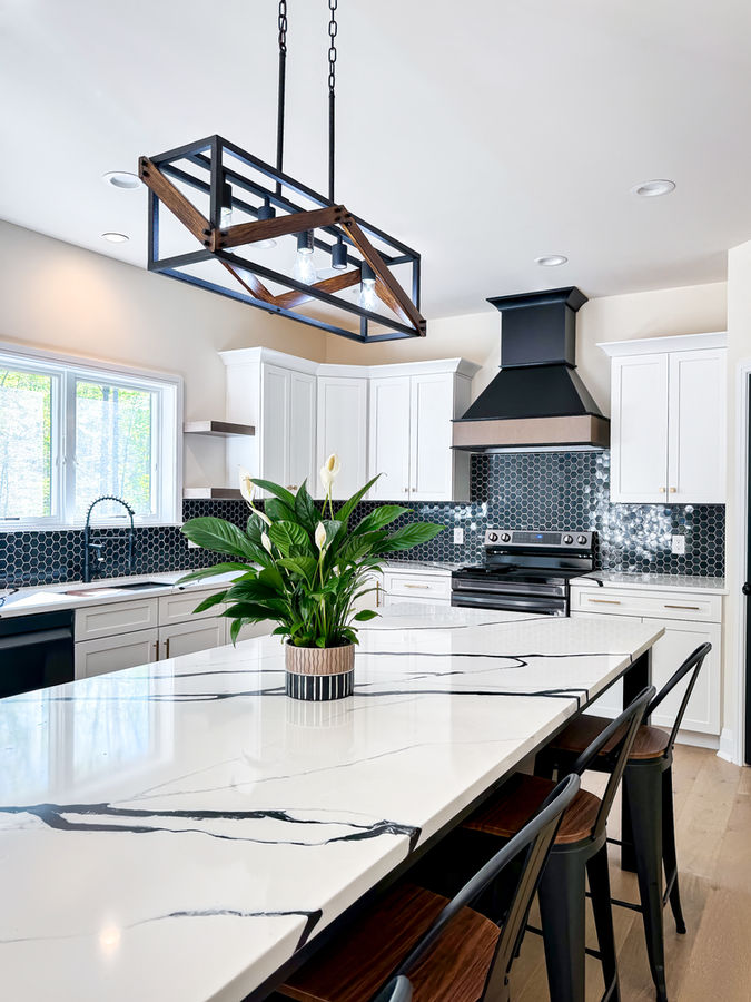While the bold black island and matching hood make a striking statement. Their sleek lines and dark allure add depth to the space. Then warmth meets contrast with the maple latte shelves and hood trim. These natural wood accents infuse the kitchen with a cozy touch. The showstopper is the MSI Surfaces Calacatta Lumanyx quartz countertop which boasts a stark white background adorned with dramatic black veins. It replicates the elegance of natural marble while offering exceptional durability and easy maintenance.