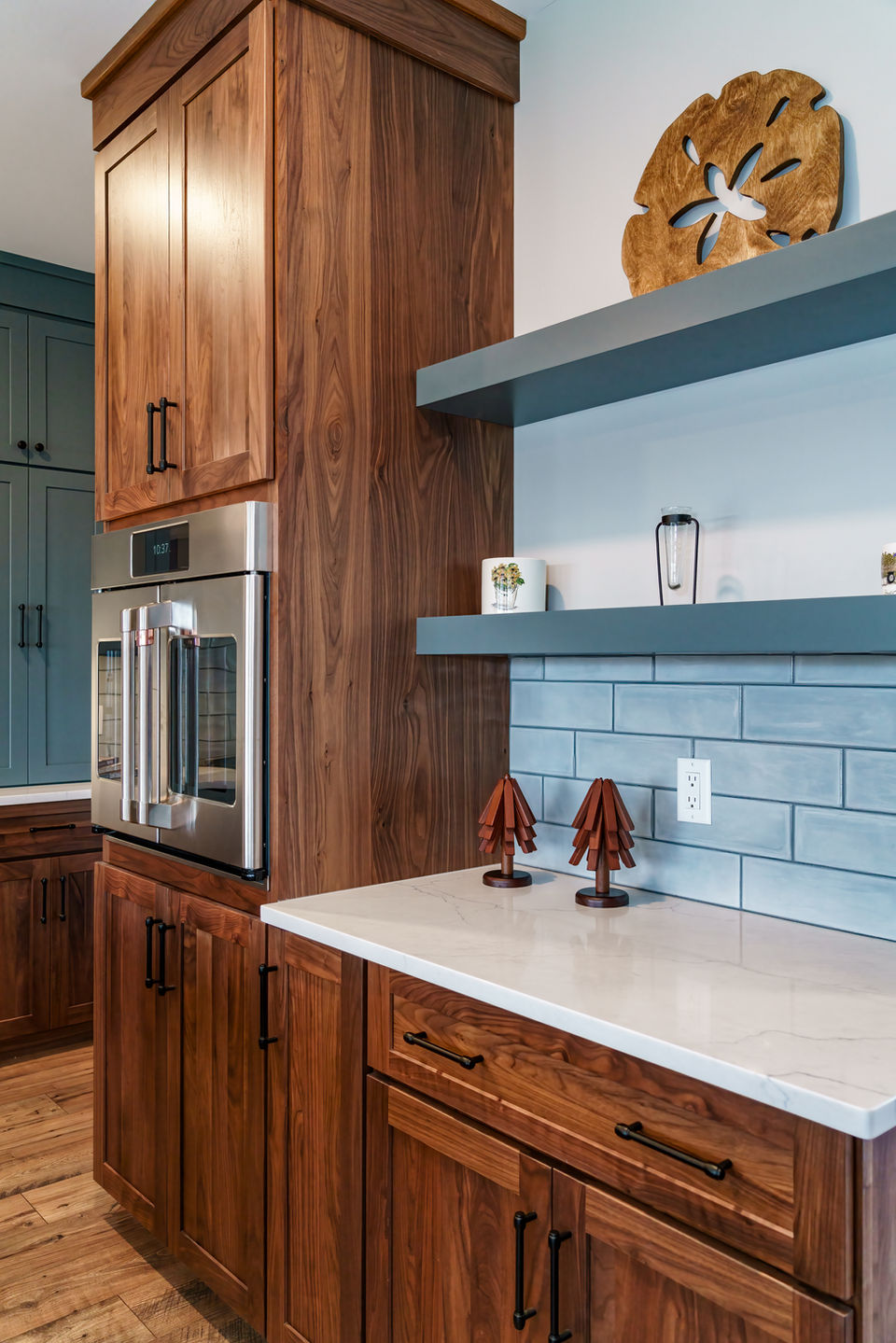 This kitchen features a timeless design with Shiloh cabinetry featuring Hanover doors. Warm Walnut Natural finishes grace the lower cabinets and oven cabinet, while the upper cabinets and large island are finished in a striking "Slate Tile" blue. The white wood hood, accented with walnut molding, adds a touch of warmth. Quartz countertops and floating shelves complete this stylish and functional kitchen.