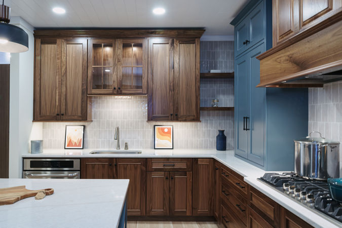 This Tedd Wood cabinet display showcases the deep, chocolate tones and distinctive grain patterns of walnut with a classic slate blue. A harmonious balance of warm and cool hues. And don't miss the sleek MSI Lumataj's quartz to add depth and sophistication.